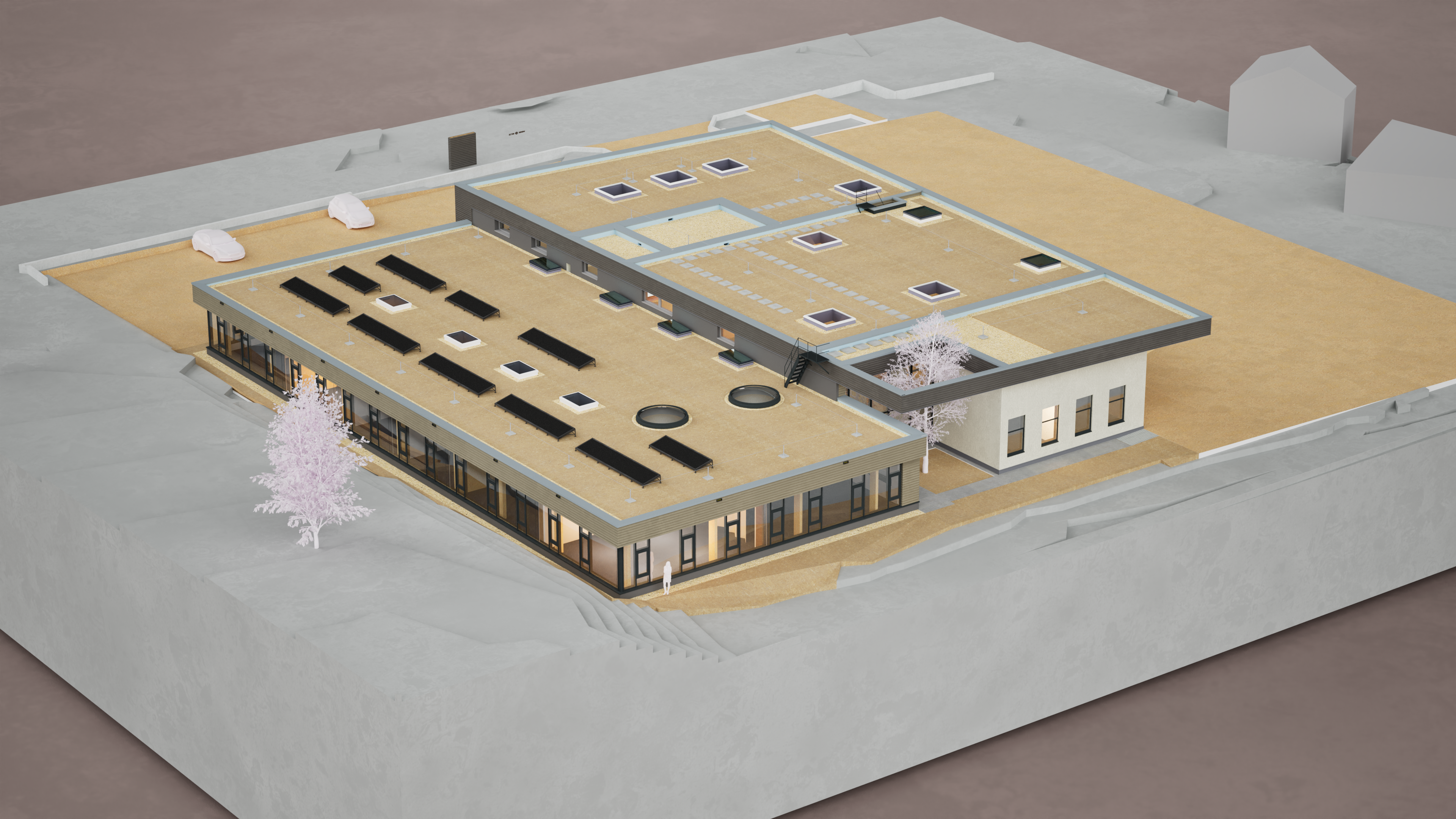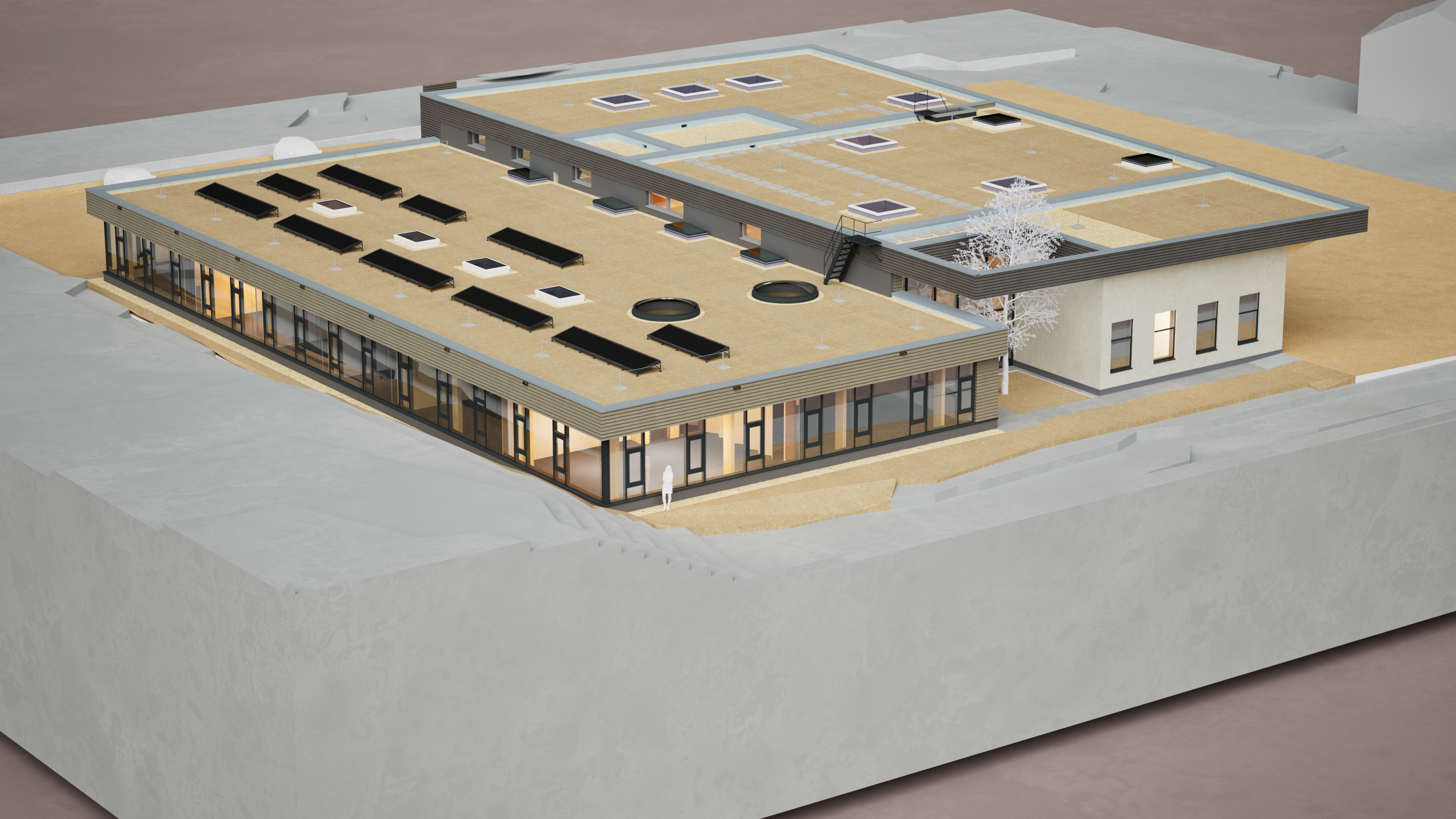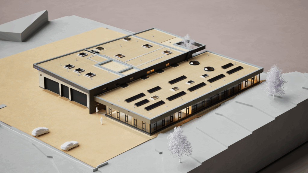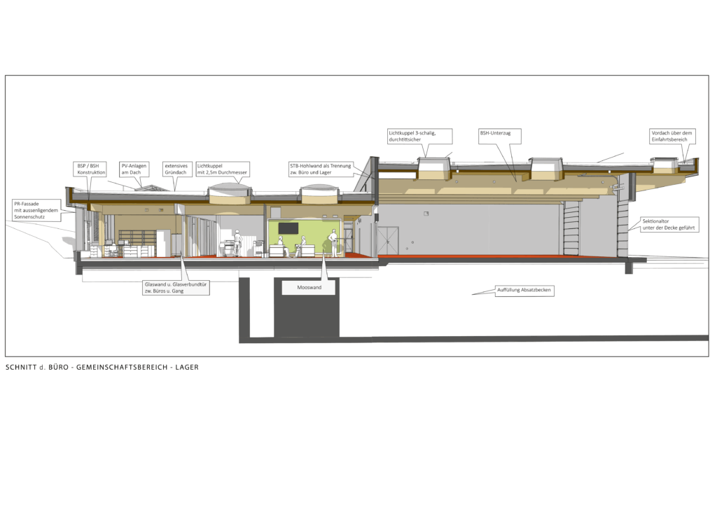 Das Ziel war eine klare Trennung der Büro- und Industriefunktion in visueller und funktionaler Hinsicht. Großer Wert wird auf eine ressourcenschonende, CO₂-optimierte Bauweise gelegt. Die Holzkonstruktion und die PV-Anlagen gewährleisten die Umweltfreundlichkeit des Projekts.