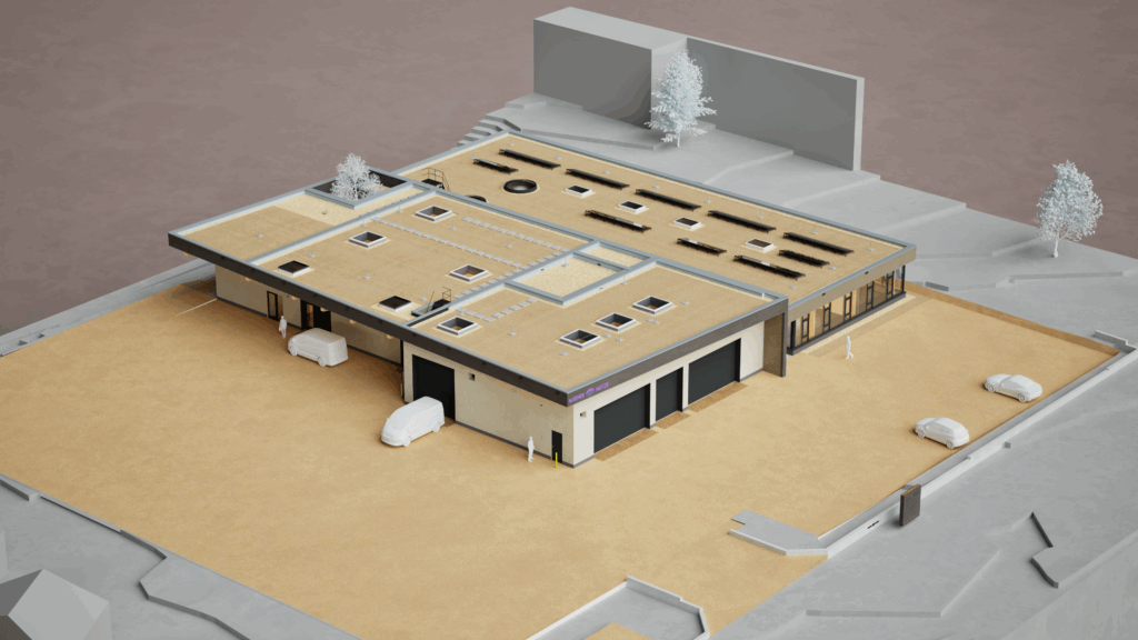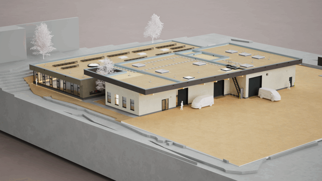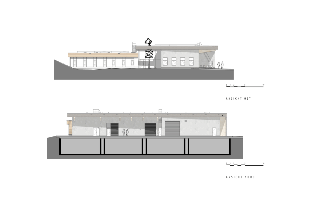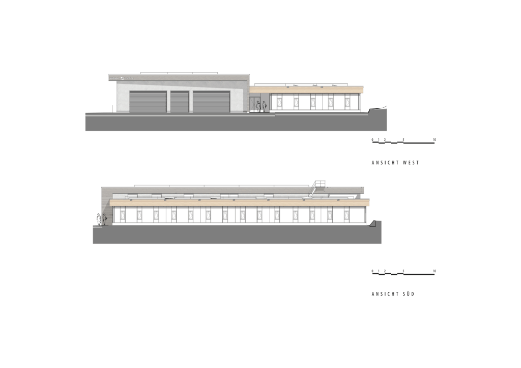 Studie und Entwurf für eine Industriehalle, Garage und Bürotrakt in Niederösterreich.